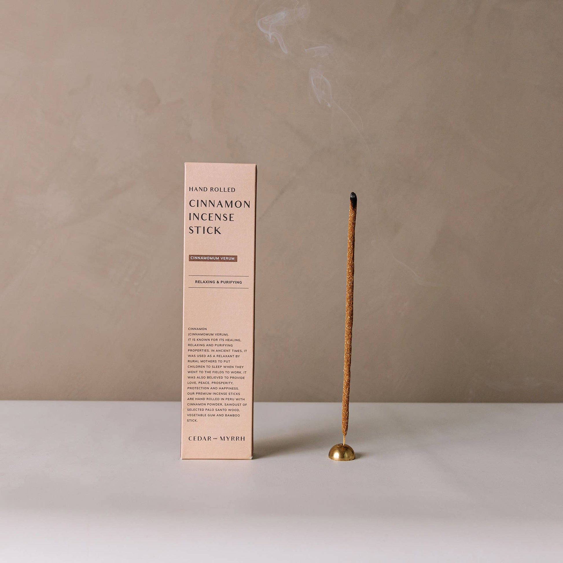 Our premium Incense Sticks are hand rolled in Peru with cinnamon powder, sawdust of selected palo santo wood, vegetable gum and bamboo stick.