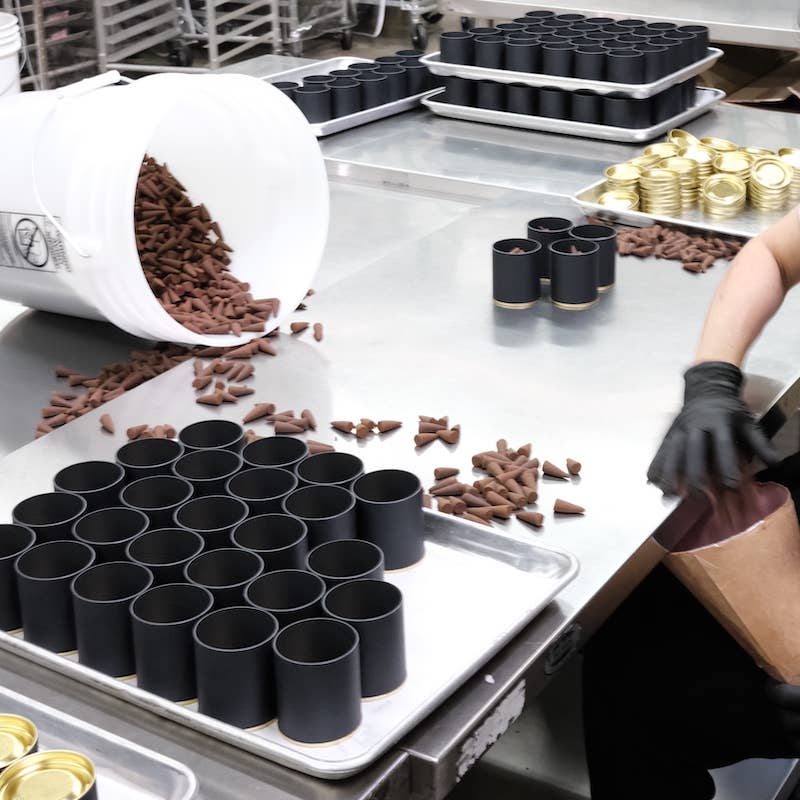 Our wood-based incense cones are hand-dipped into fine fragrance oils at our Los Angeles factory.