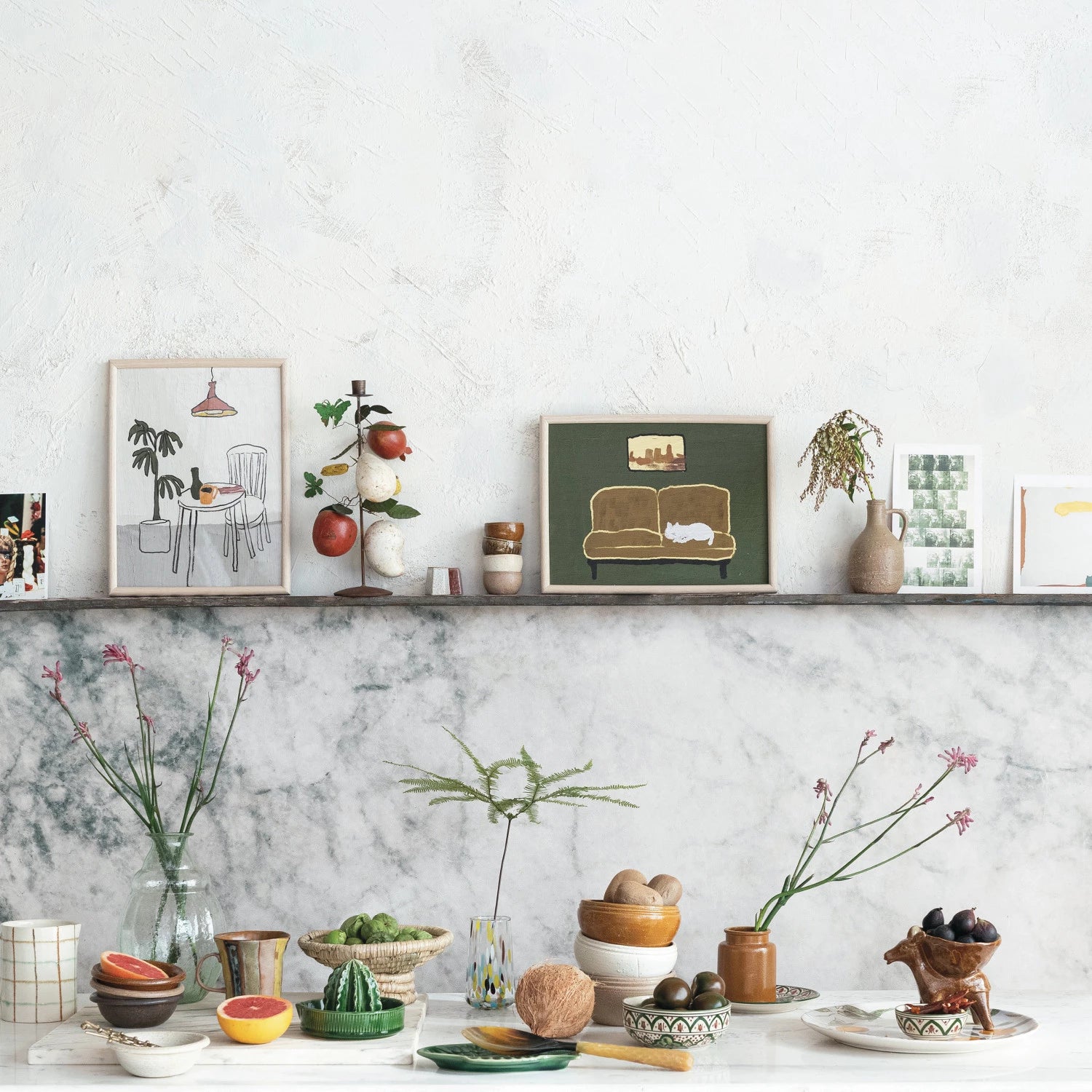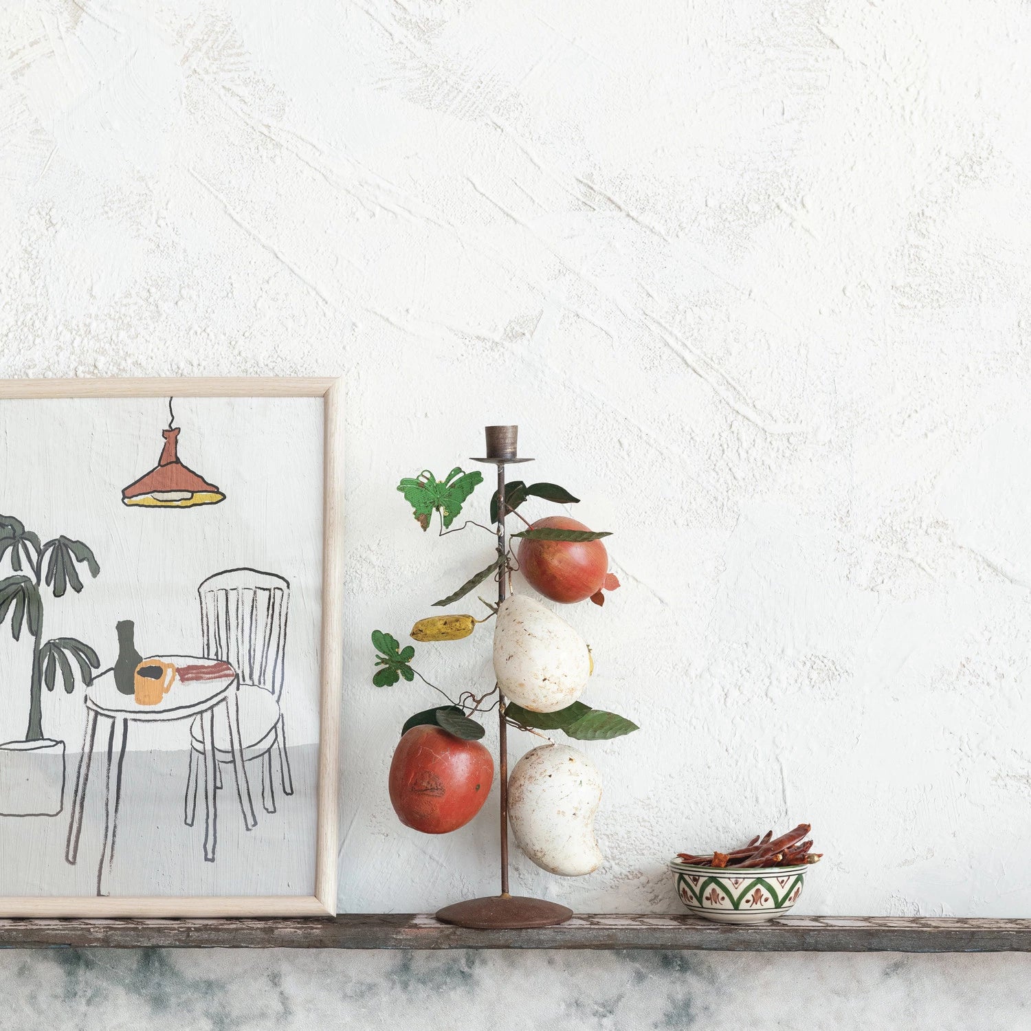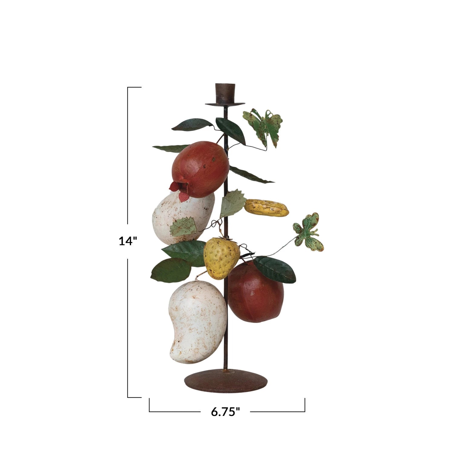 This Taper Candle Holder is a celebration of the harvest, standing 14 inches tall and extending 6.75 inches long. Its intricate metalwork, featuring an array of fruits and leaves, is finished in a palette that reflects the rich colors of a bountiful orchard. The round base provides stability, while the detailed design adds a playful yet elegant touch to any setting. Whether it's part of a festive tablescape or adding a bit of whimsy to a quiet corner, this candle holder is sure to delight with its unique character and rustic charm.