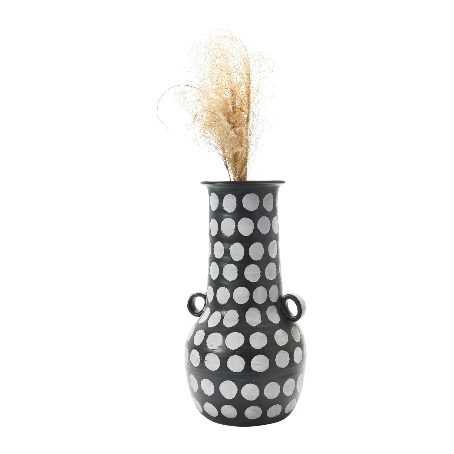 This vase is the perfect unique piece for any table top. Hand-painted, this terracotta vase features a fun black-and-white polka-dot pattern. This vase easily anchors entryways, nightstands, or dressers and blends in with any eclectic decor. Fill with fresh or faux florals for an easy decoration. Perfect for an eclectic home. Great statement piece for any room.