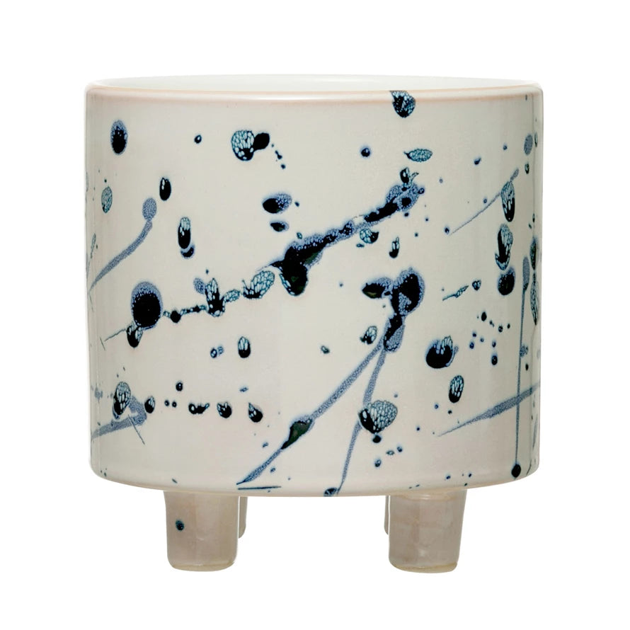 5-3/4" Round x 6"H Stoneware Footed Planter w/ Splatter Design, White & Blue (Holds 5" Pot)